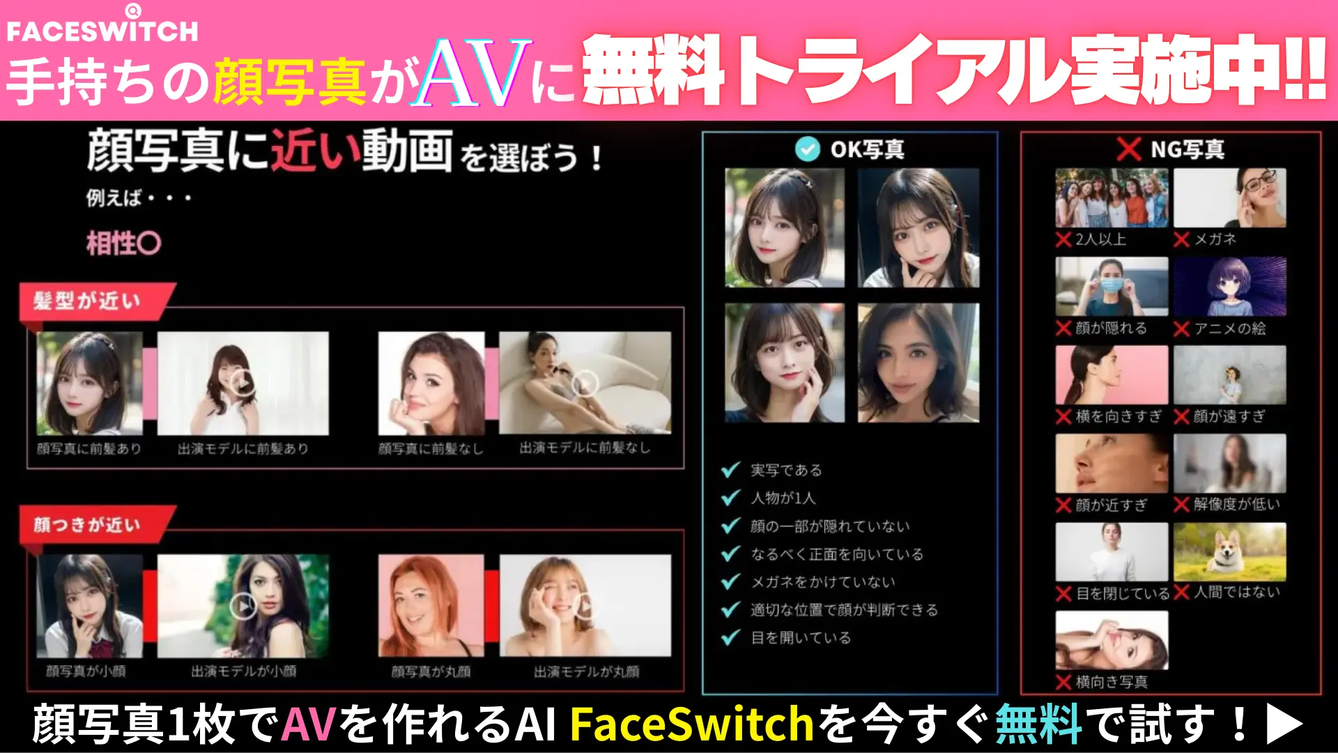 国産でアダルトビデオと顔入れ替えができるサービスは現状FaceSwitchのみです。
