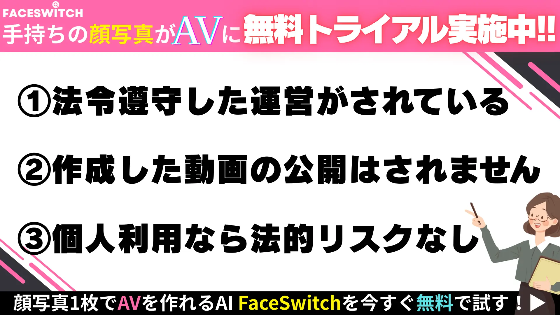 運営側も弁護士事務所によるリーガルチェックを受けており、さらに国内AVメーカーと提携して使用許諾を得た元動画を採用するなど、合法性を確保しています。この点は海外製のAIサービスとは一線を画す特徴といえるでしょう。