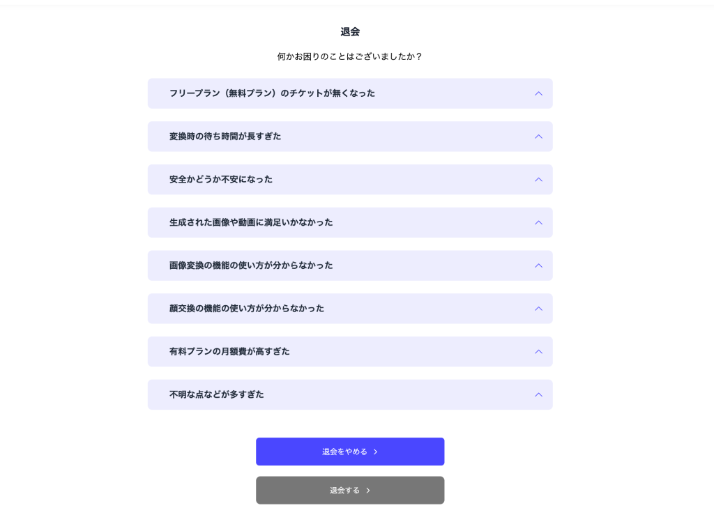 退会確認ページでは、退会理由の選択画面が表示されます。以下の選択肢から、該当するものをクリックしてください。