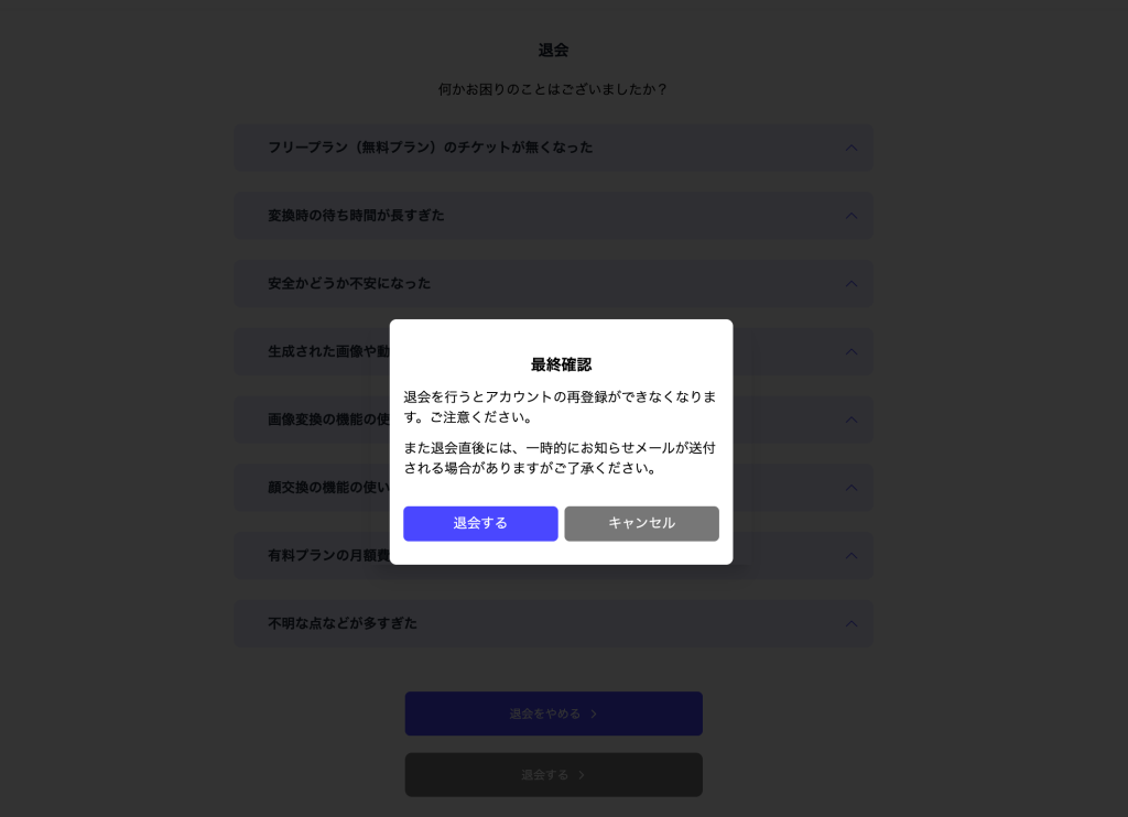 退会手続きが完了すると、アカウントに紐づいた生成画像・変換履歴・アップロードした元画像などのデータはサーバーから削除されます。