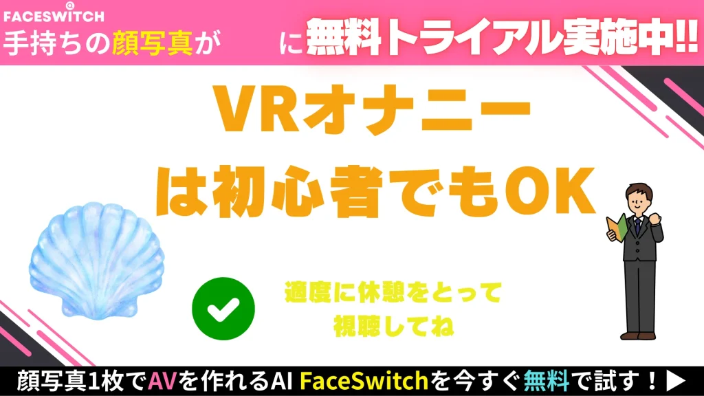 - VRオナニーは、身体に有害な面もあるので長時間の視聴は避けるとともに休憩をはさんで適度に行うべき